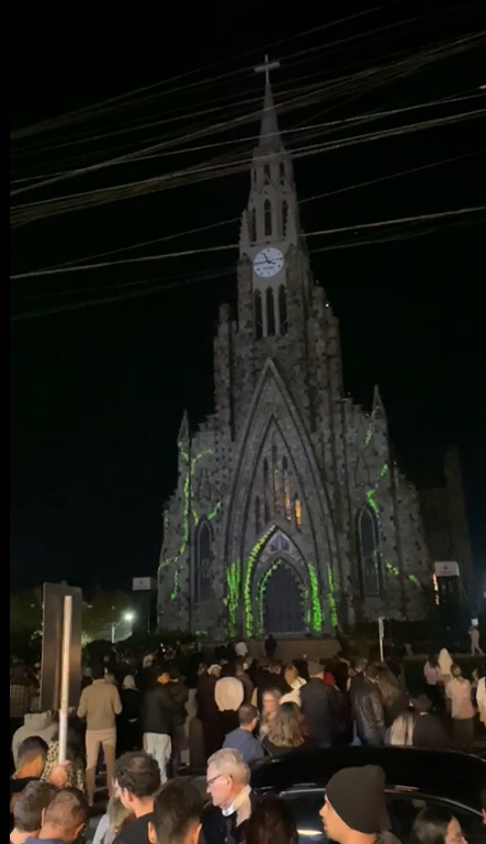 Expanded projection on the Cathedral of the city of Canela at the Canela Light Festival. The building's facade is the backdrop for the image of the advance of green ivy, which progressively covers the architecture.